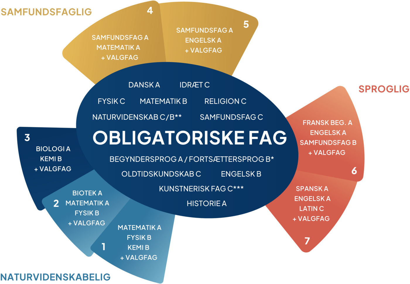 I skemaet nedenfor kan du se, hvilke fag du skal have på de forskellige klassetrin: